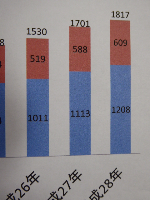 胃が 1,208 件、大腸が 609 件の計 1,817 件となり、さらに増加していることがわかります。 「量より質」と肝に銘じておりますが、それでも決して楽な検査ではない内視鏡を、これだけの数の患者さん方が当院で受けてくださったことに、素直に感謝したいと思いま